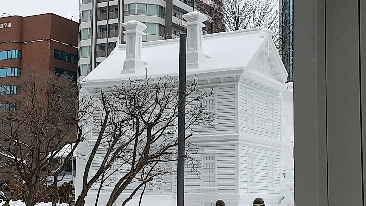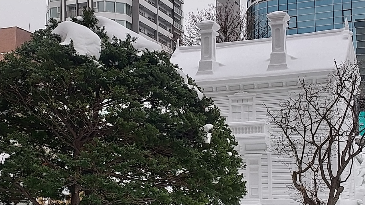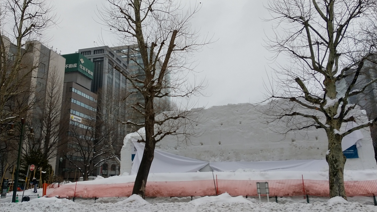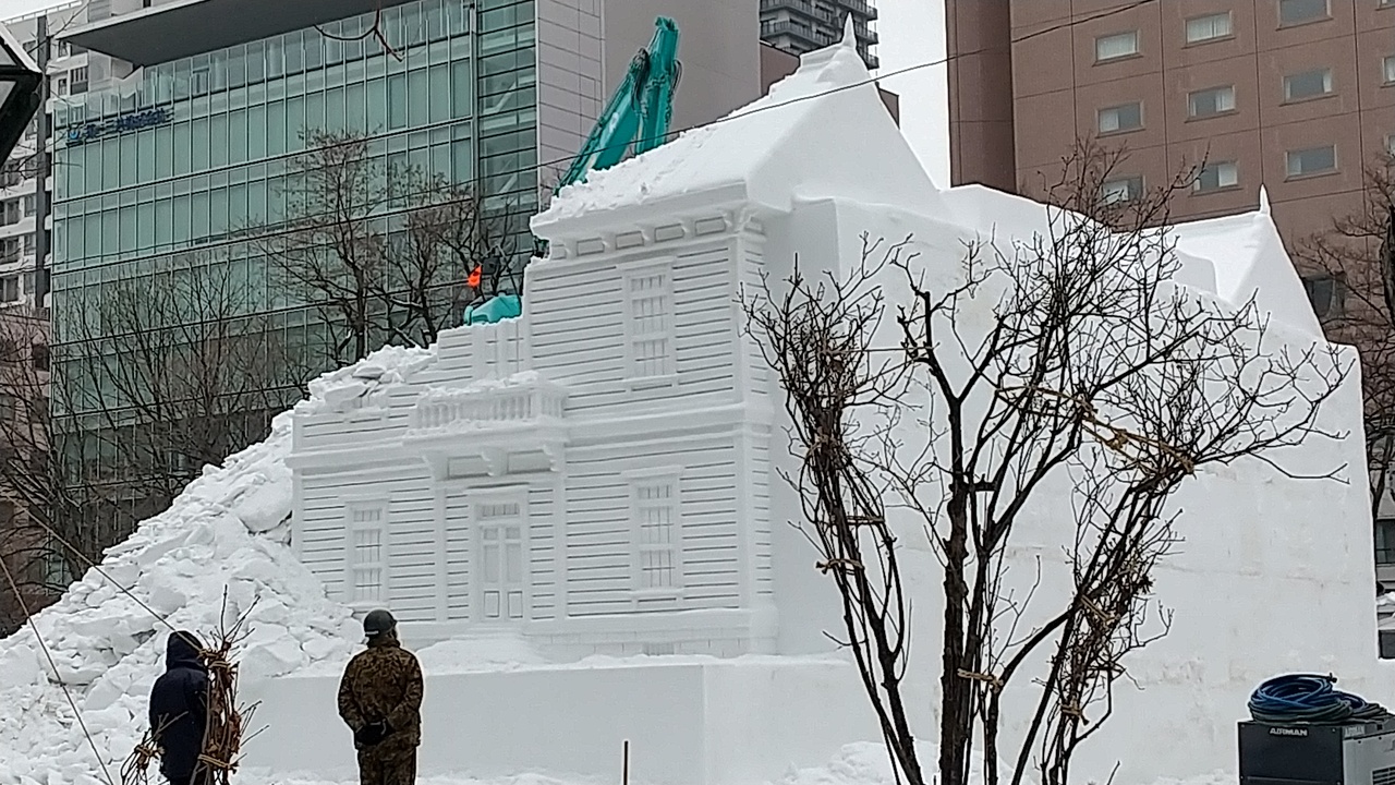 シャベルカーや重機が入り雪まつりの華やかさは呆気なく終わっている様子でしたがテレビ塔から離れた場所の雪像は観る事ができ解体される様子が見学できました。快晴できらきら輝く雪と青空で観光客も沢山いました。