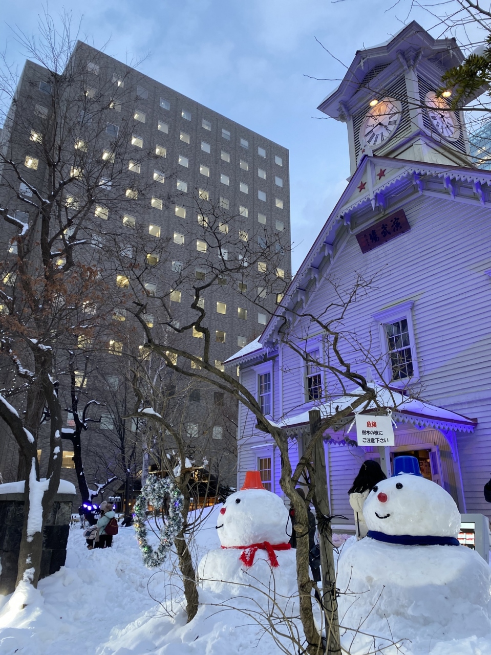 時計台の前には撮影スポットがいくつかつくられていて、スマホスタンドが設置されていて便利でした。雪の白さと時計台のレトロな感じが合わさって、素敵な雰囲気でした。