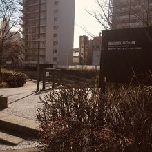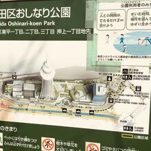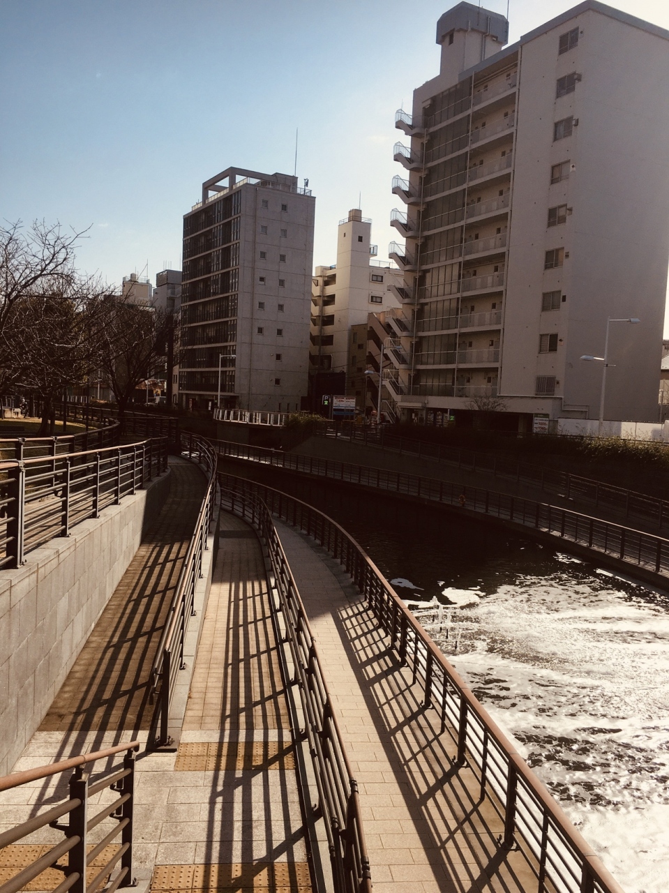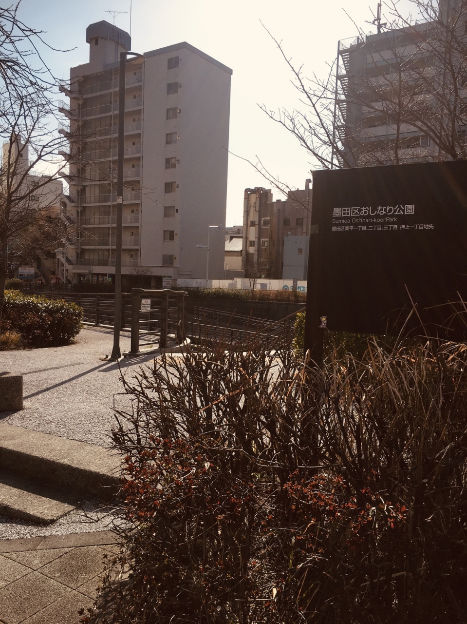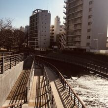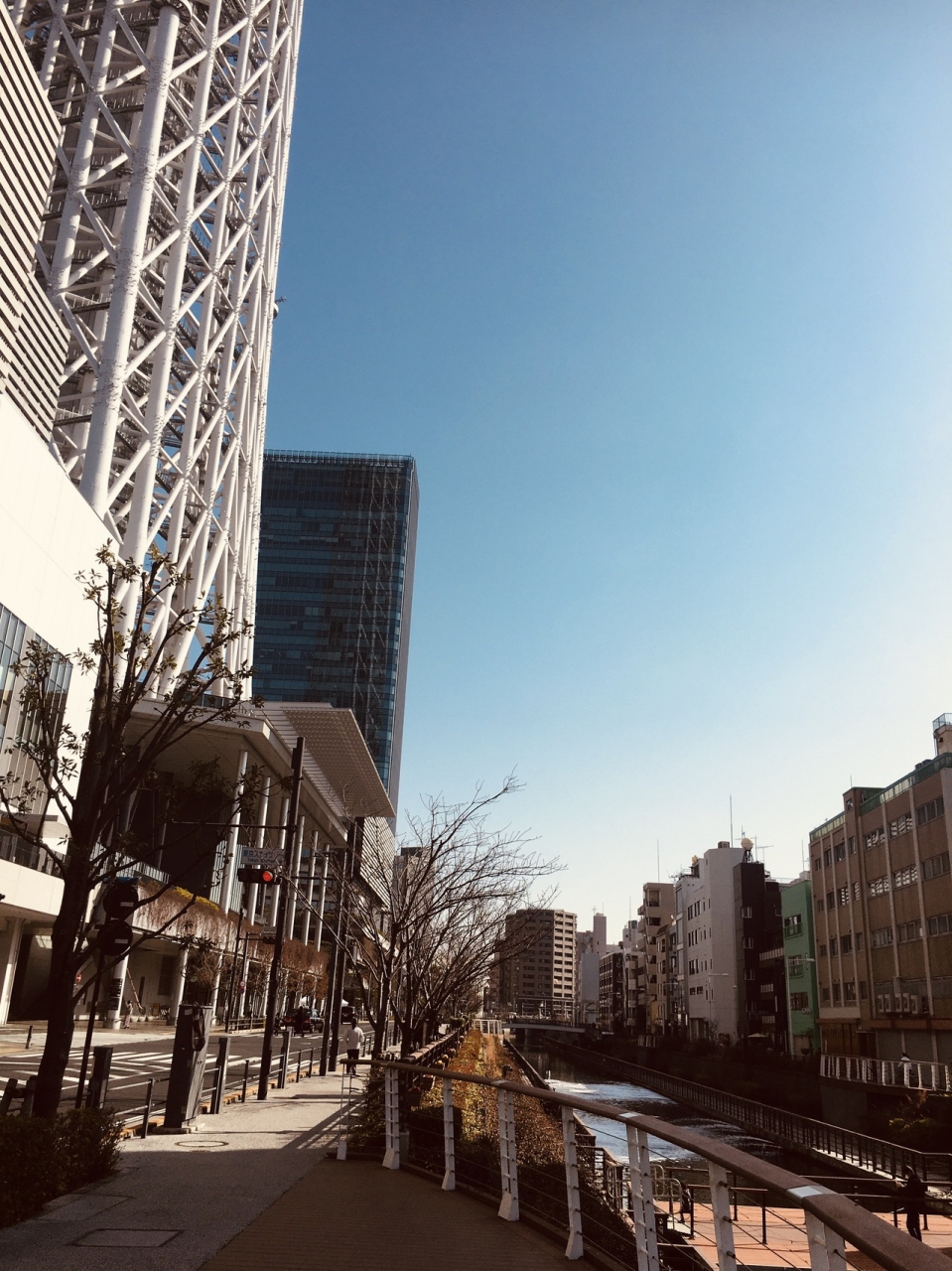 東京スカイツリーに沿った公園で、公園と言うより遊歩道が伸びてような感じでした。地面より下がった位置にあり川幅の高さより少し高いぐらいの場所でした。川沿いのため細長く、鋪装された道です。上も遊歩道になっています。