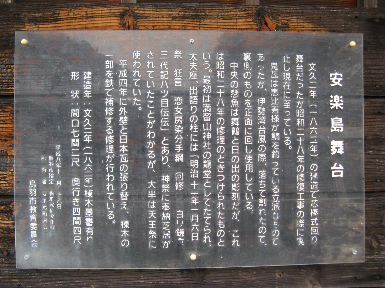 鳥羽市安楽島町の東端、安楽島海水浴場の近くにあります。鳥羽市の有形文化財に指定されている文久2年(1862年)に建造された舞台です。今もお祭りなどで利用されているようですが、訪れた時は建物は閉じられていて建物の外観だけ観て、舞台そのものを観ることはできませんでした。木造の大きな立派な建物は貫禄がありました。