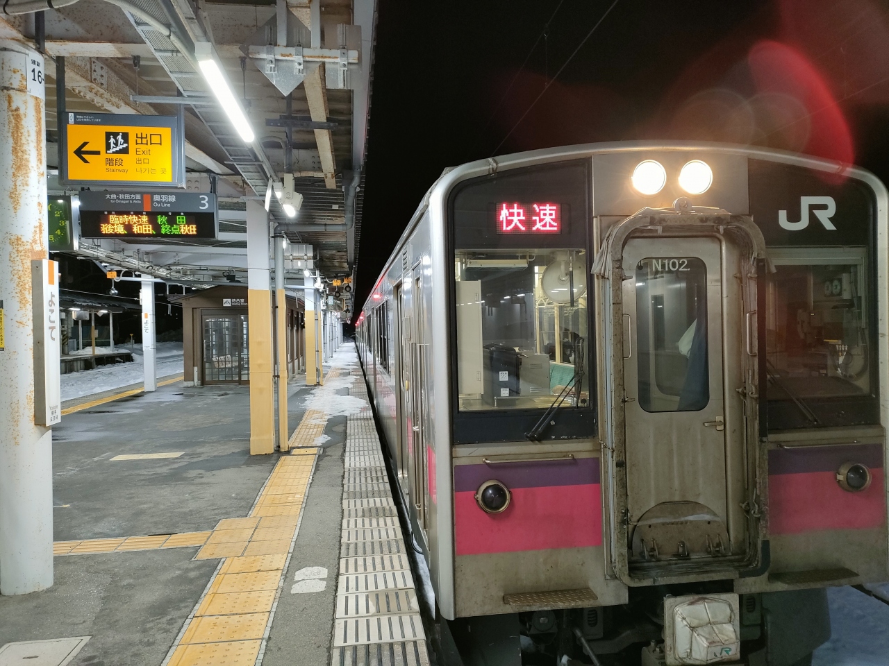 福島、山形、秋田、青森を結ぶ487kmの長大路線ですが、山形まではともかく、現在、秋田や青森まで行く通常ルートとしては使われないと思います。昔は、一時期の”あけぼの”など直通運転をしていた寝台列車などもあったようですが、現在では通しの普通列車などは無く、そもそも山形と秋田の2種類の新幹線が乗り入れるなど、軌道幅が区間によってまちまちだったり、新庄、院内、秋田などで運行体系も変わっていたりするなど、同じ奥羽本線とは思えず、寸断されている感があります。