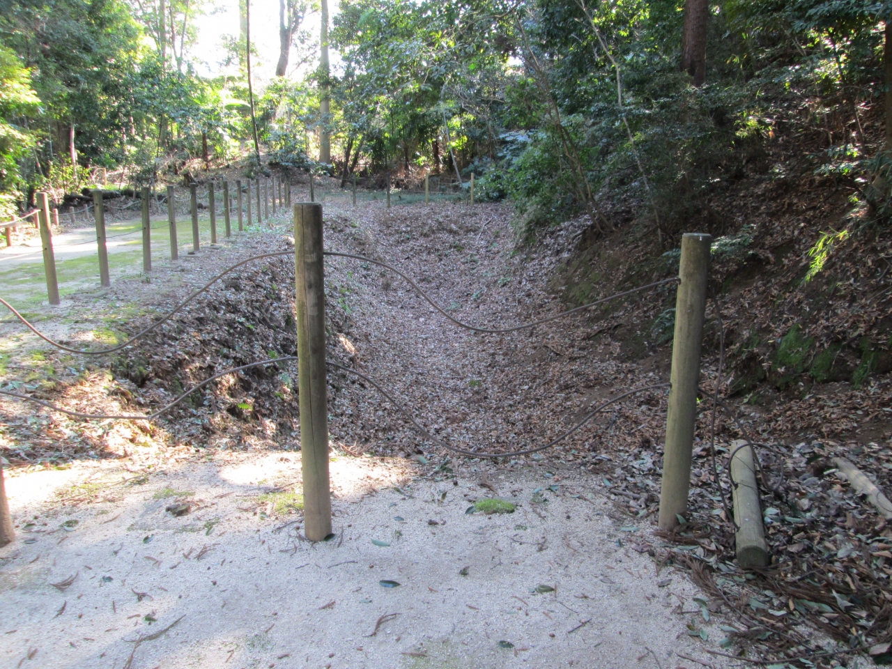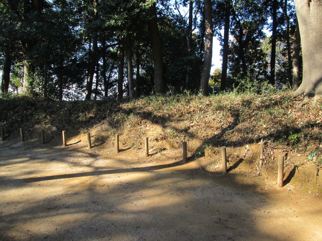 小金城跡の今は整備されて歴史公園になっています。小金城の築城主は高城胤吉、築城年は1462年、廃城は1590年です遺構は虎口、郭跡、土塁、畝堀、障子堀がみられます。公園の入口に建つ碑を見て、登城口の木段を登ると金杉口虎口があり、小さな郭跡があります。更に木段を登ると、本郭跡に出ます。小金城石碑が建ち、周囲に土塁が見られます。本郭の南に畝堀が、北には障子堀が見られます。遺構は結構多く残っているので、城ファンには満足できる城跡です。ただ、障子堀、畝堀は土で堀底が埋まってしまい、障子や畝には見えません。発掘調査の後、一か所だけでも障子であるとわかるように展示していただけると有難いです。砂地のためすぐに埋まってしまうのかもしれません