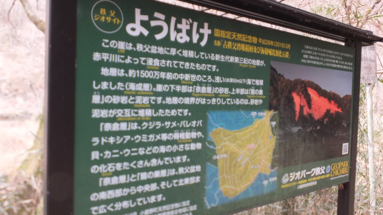 埼玉の秩父の観光で訪問しました。近くのおがの化石館から遠景も見えますが、せっかくなので近くの川のほうまで散策です。なかなか迫力のある地層が露頭していてすごいです。ちなみに「ようばけ」とは太陽の当たる崖という意味とのこと。