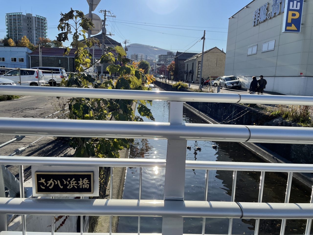 観光客で賑わう堺町通りの入口に架かる堺橋を過ぎて運河方面へ進むとあります。臨港線に架かる橋で、幅も広く車の通りも多いので、一見は橋とは分かりにくかったです。橋から見える天狗山も良い眺めで、カモが気持ち良さそうに泳いでいたのが印象的でした。