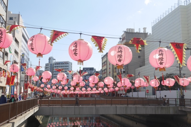 長崎の中華街のあたりを流れる川です。今回はランタン祭りメインで訪れたため、期間中ということでピンクのちょうちん(ランタン、ですね)が川の上にたくさん!写真は昼間のものですが、夜もまた違った雰囲気になっていてよかったです。川にうつるランタンもまた風流でした。