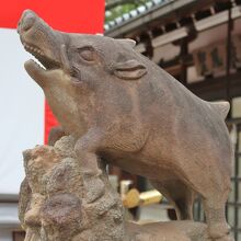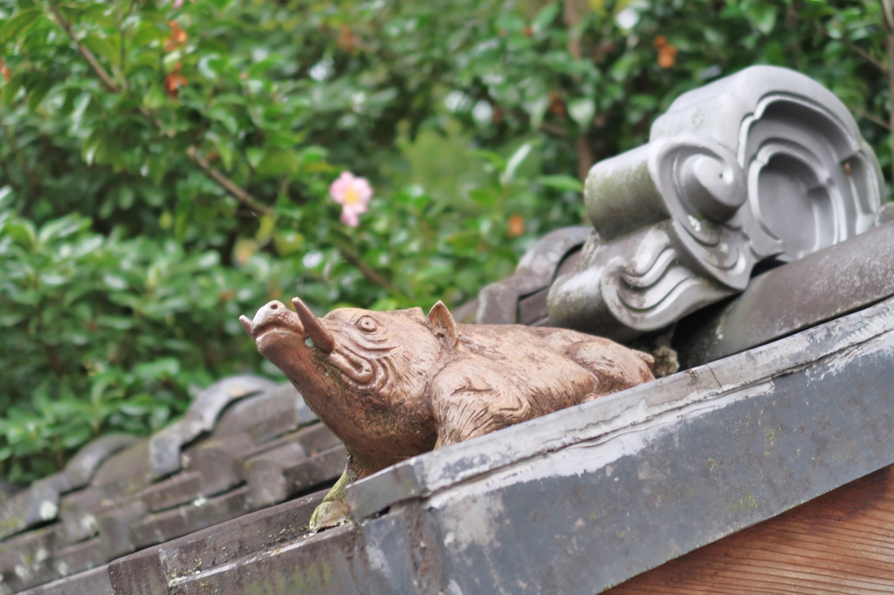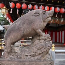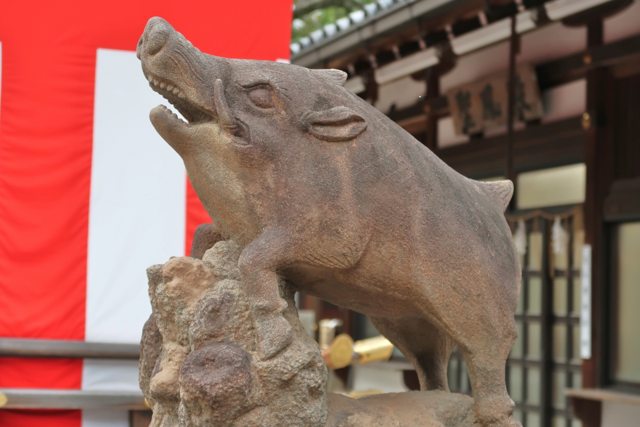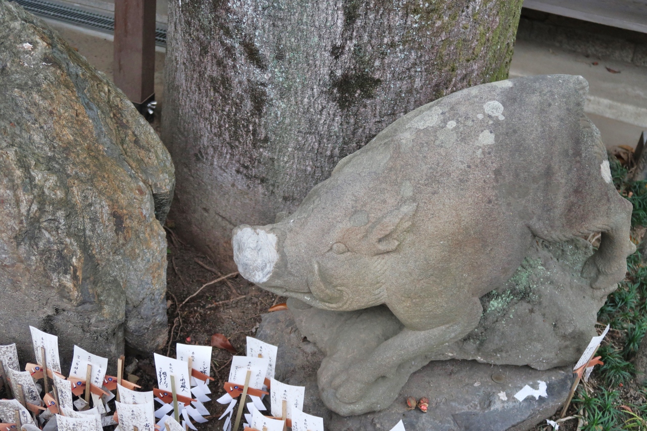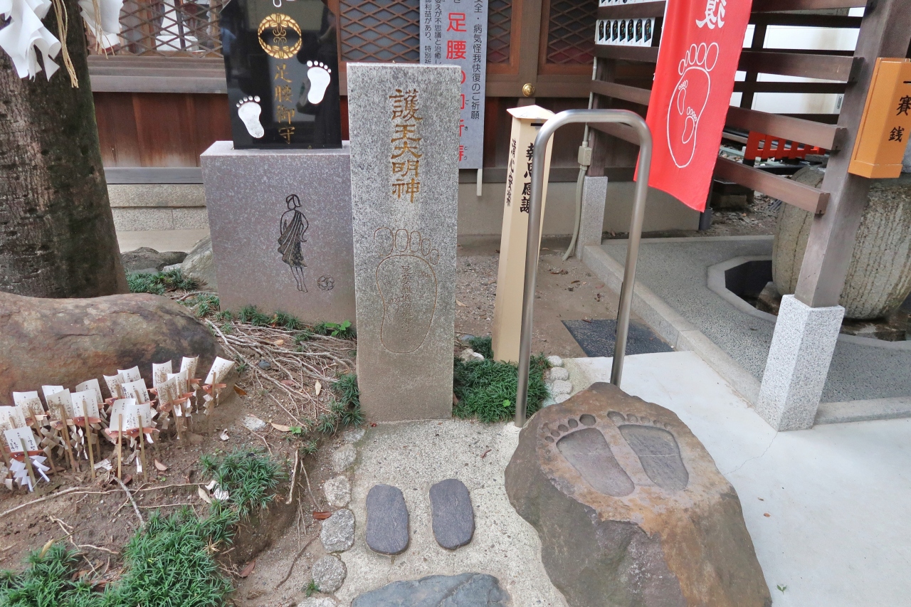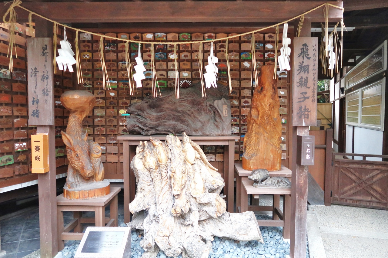境内には、和気清麻呂公を守った300頭の猪にちなみ、たくさんの猪像がありました。足腰の不調が改善するご利益があるとのこと、こちらの神社に辿り着いた時は、連日の京都観光の累積疲労でまさに足腰立たず状態だったので、早速、足の形にくぼんだ石の上にのって祈願しました。