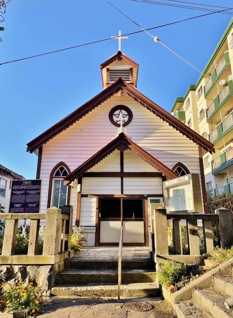 花園町から水天宮に向かう途中、鳥居を過ぎて石段を上って行くと左手に白い壁が印象的な教会が建っています。1908年に建築、小樽の歴史的建造物にも指定されています。外観のみの見学でしたがシンプルで美しい教会です。水天宮と併せて見学するのが良さそうです。