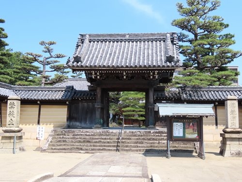 その山門は寺町通から一本南の通りに南面しています。門左手の「禁殺生」と刻まれた石柱が力強いですね。1829年(文政12年)、紀州藩10代藩主徳川治宝の命により創建された浄土宗の寺院です。首大仏(首だけの大仏様)で名が知られています。周辺にいくつも札所が置かれている和歌山西国三十三箇所の8番がこのお寺です。
