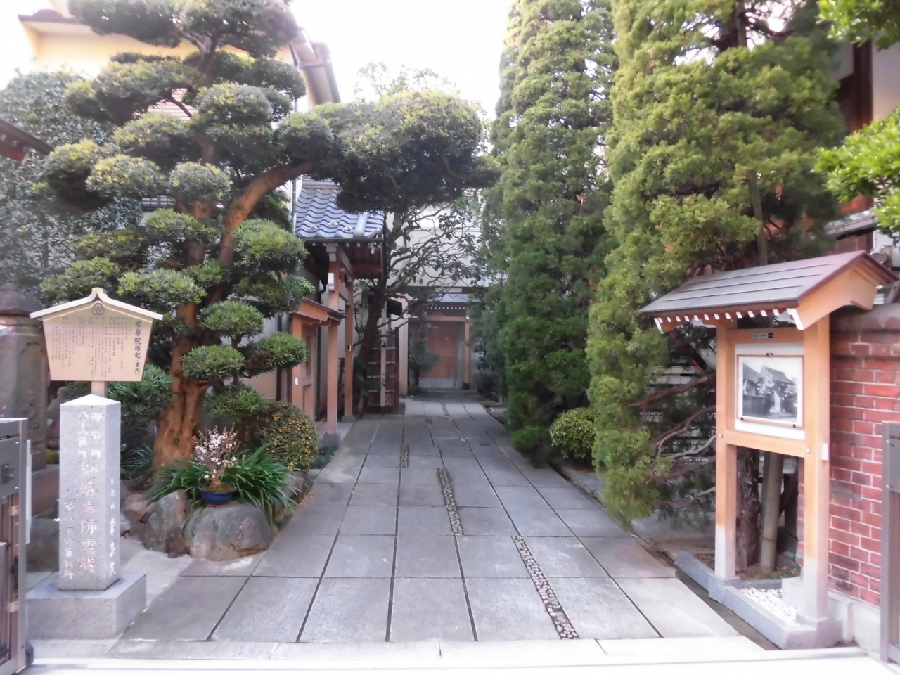 富阪上交差点からすぐの場所にあるお寺です。規模はそれほど大きくはありませんが、境内に続く参道の植木が、よく手入れが行き届いていて、気持ちが良い雰囲気のお寺でした。境内に小島鳥水という日本近代登山先駆者と刻まれた石碑もありました。確か日本山岳協会の初代会長だった方だと思いますが、まさかこのお寺にお墓があるとは知りませんでした。