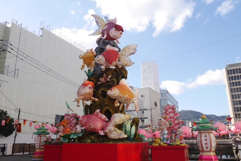 新地中華街の横を流れる、銅座川にかかる幅の広い橋です。以前訪れたときあまり橋感はなく広場みたいだな〜と思ったら、なんと、ランタン祭りの季節になると大きなオブジェが設置されていました!金魚のオブジェです。かわいい〜。ほかにもいくつかの小さなオブジェが設置されていて、写真を撮る人でにぎわっていました。