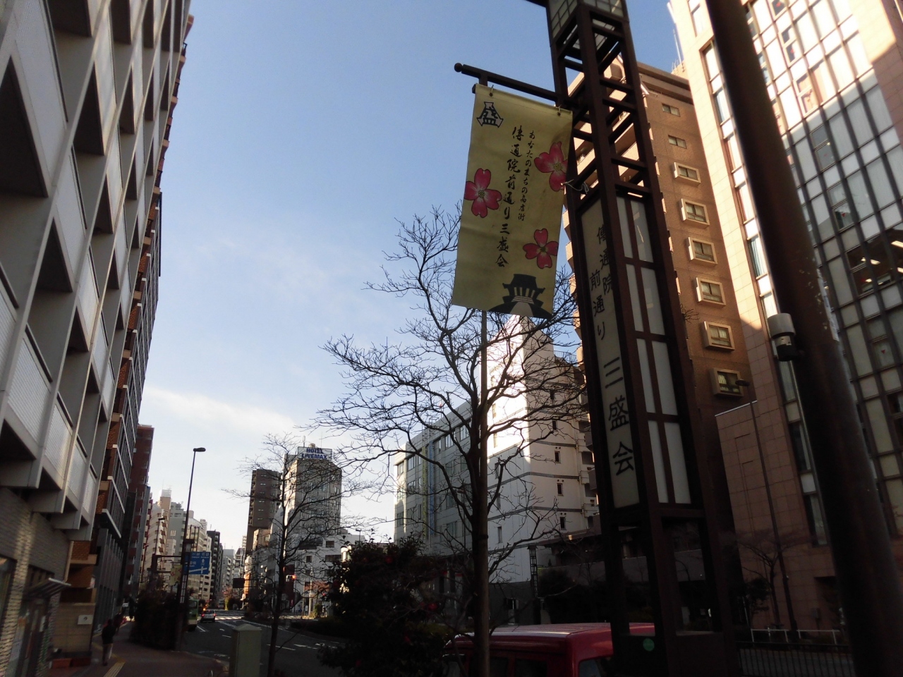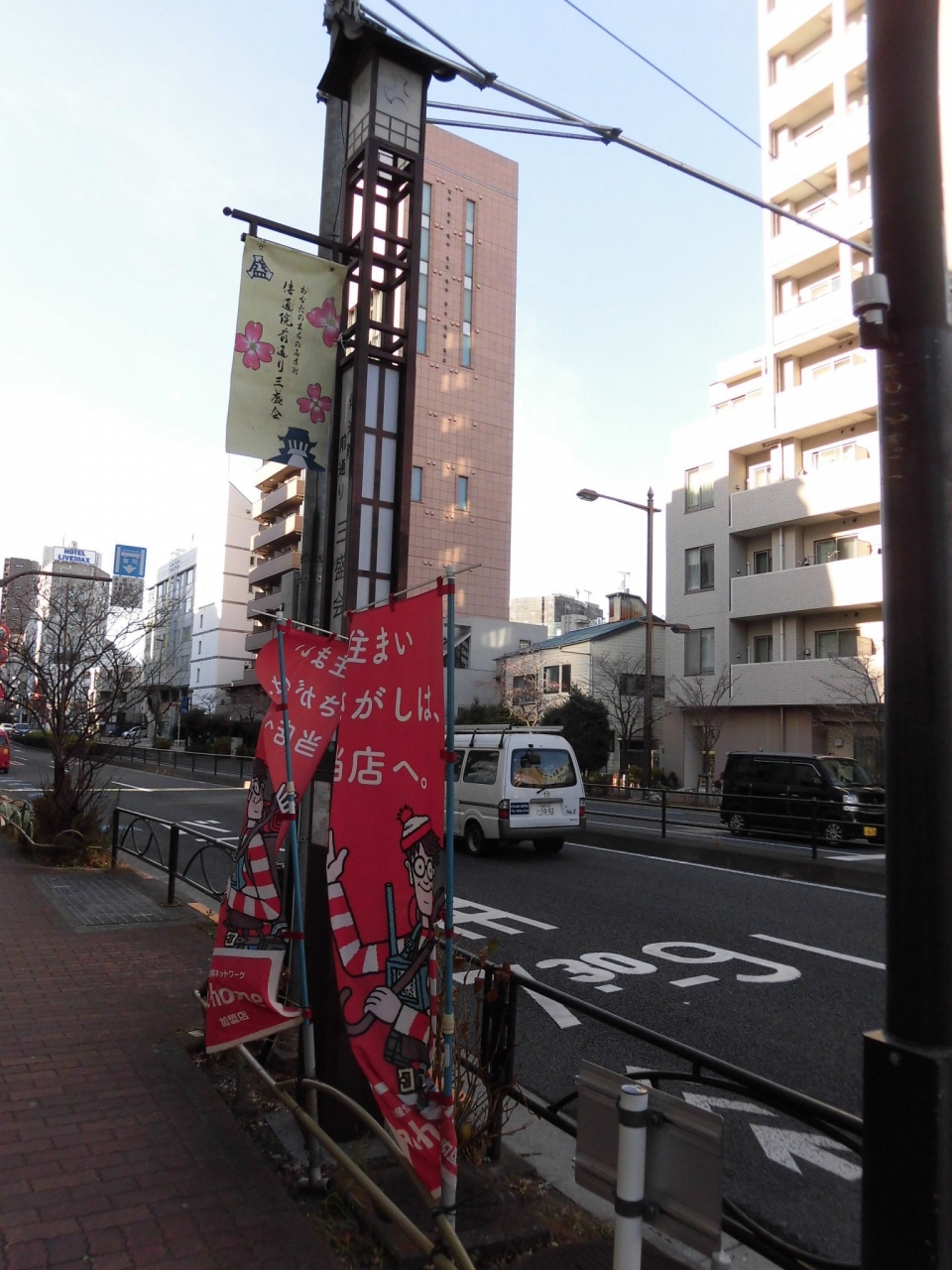 小石川の伝通院に参詣で向かう時に、春日通りに沿った商店街を通りました。交通量も多く、道路の道幅が広いので、あまり商店街といった雰囲気は感じられません。それでも商店会の旗を飾った街灯が、どこか伝通院に結びついているようなデザインで面白かったです。