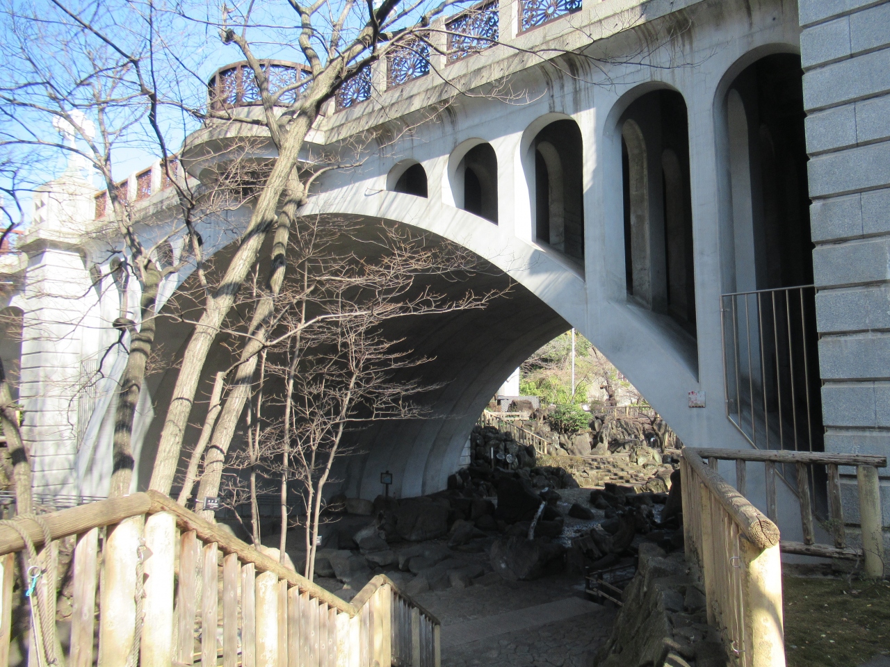 凧市で王子を訪れた際に立ち寄りました。王子駅中央口から2分ほど、飛鳥山公園横の坂道を上がったところに造られている橋です。石神井川に架けられた橋で、欄干には江戸時代の飛鳥山の花見の様子が描かれたレリーフがはめ込まれていますが、90年以上前に架けられたため、絵や文字がはっきりしないのが残念でした。橋の下には飛鳥山と共に桜の名所になっている音無親水公園があり、桜の時期は花見客で大変賑わいます。橋の親柱ががっしりしていて力強さが感じられました。