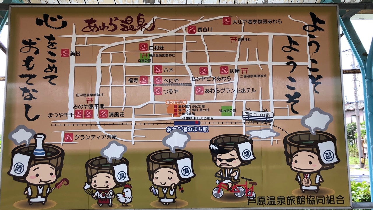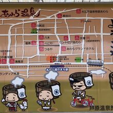 えちぜん鉄道・あわら湯のまち駅から徒歩10分ぐらいの場所にあります。小さな広場です。写真の地図でいうと、駅から左へ進んだ辺りです。明治時代、この辺りで温泉が発見されました。発祥地を示す看板が建っています。