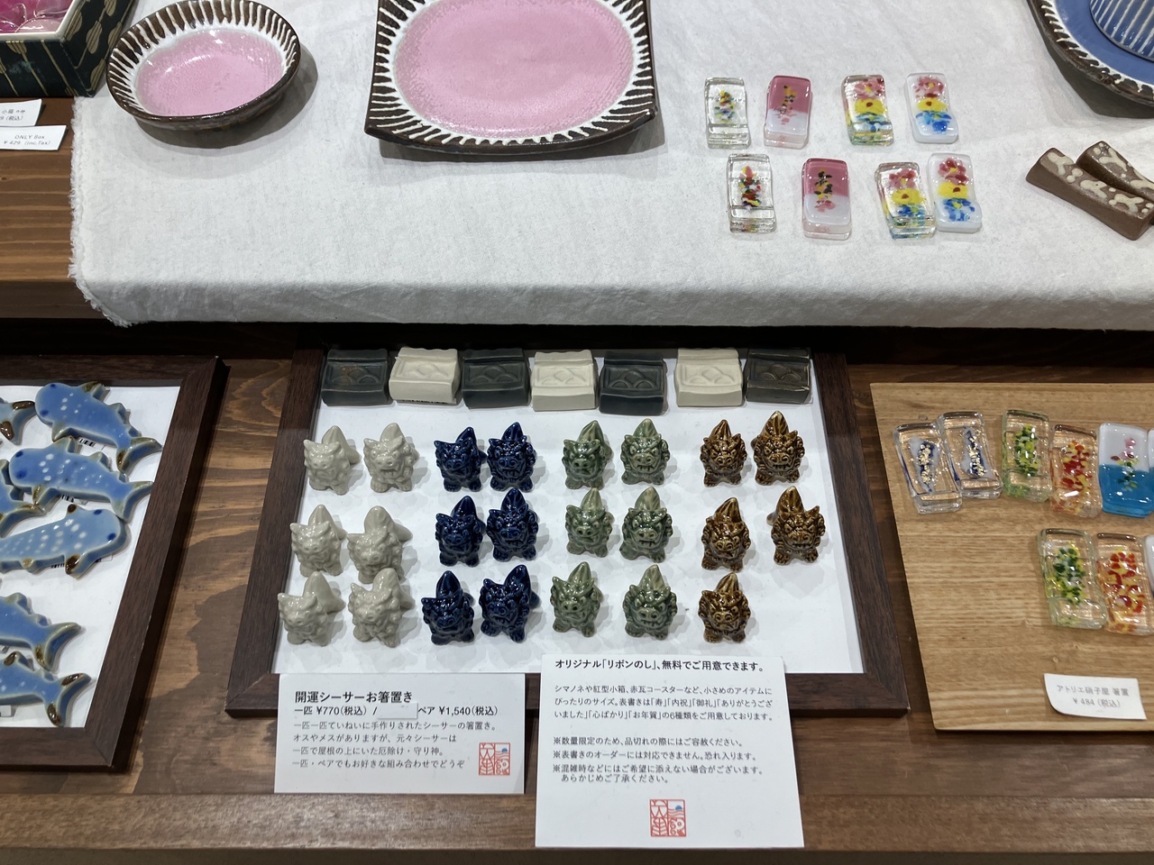 那覇空港の連結ターミナル2階、「ゆいにちストリート」にあります。沖縄の人気工房の作品を選りすぐって集めたセレクトショップです。琉球ガラス、やちむん、アクセサリー、沖縄菓子などどれもデザイン性の高い魅力的な作品が展示販売されていました。シーサーの箸置きがとても可愛いかったです。ぜひ一度店内を覗いてください。