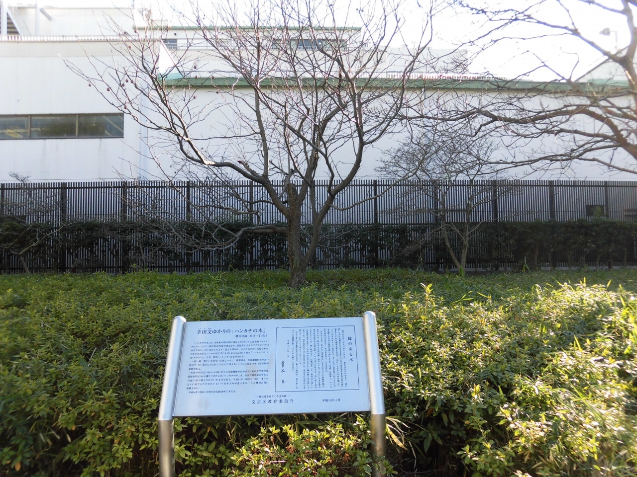 文京シビックセンター前の、区立礫川公園内に、植栽の中に幸田文ゆかりのハンカチの木と記された案内プレートがあります。由来も書かれていて、とても珍しい木のようです。花が咲くと白いハンカチのようになるらしいのですが、残念ながら今は冬なので、花も葉も何もない木になっていて、少し寂しい気になりました。
