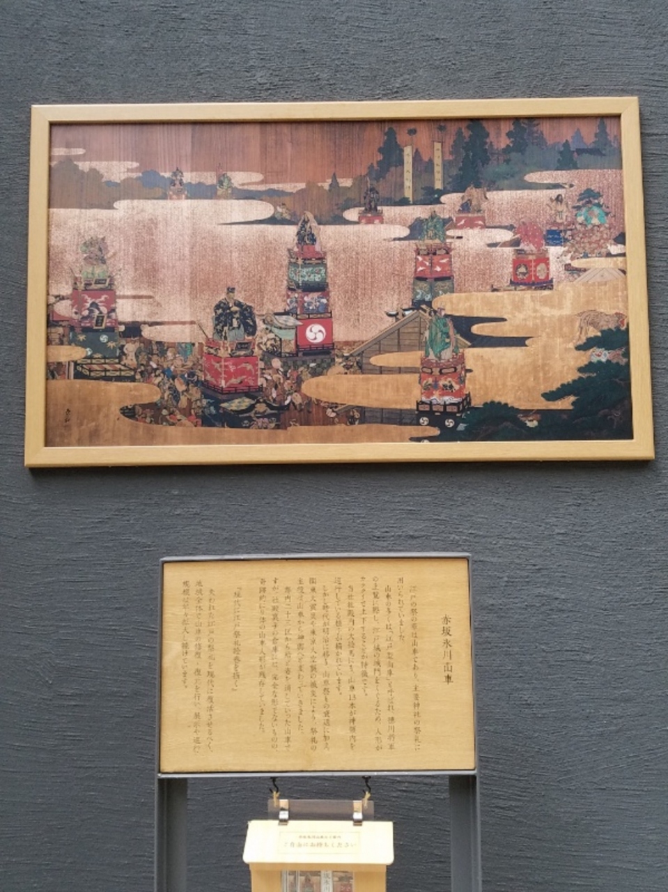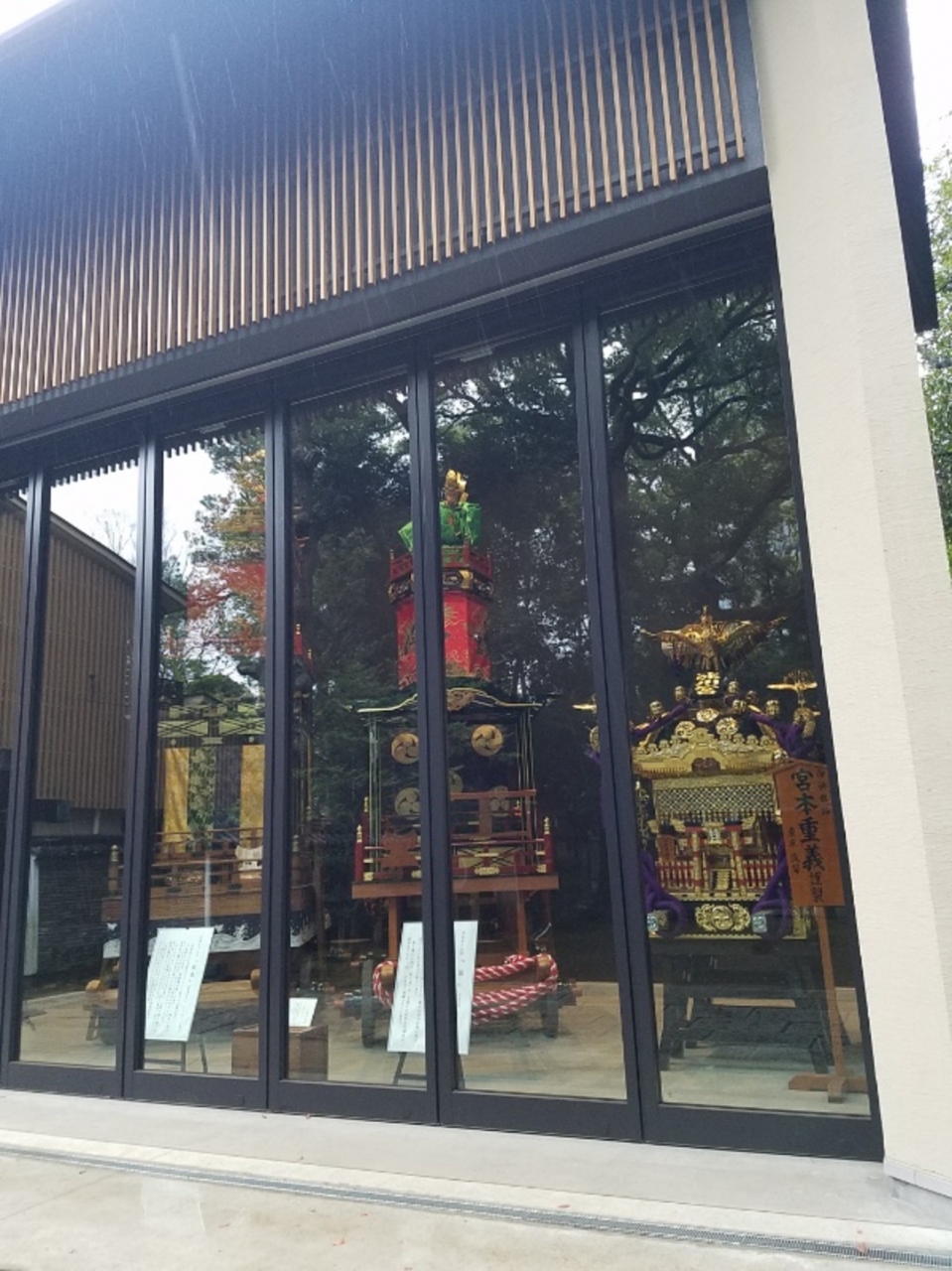 赤坂氷川神社の境内を散策しているとガラス張りの建物にお神輿が展示されていました。よく見ると左の二体は背が高い山車でしかもてっぺんに人形が乗っています。人形の乗った山車というと千葉の佐原の大祭を思い出しましたがこちらは江戸型山車といってかつては江戸のお祭りでは山車が花形だったそうです。山車を見にいつか佐原を訪れたいなと思っていたのですが灯台もと暗し的な出会いでした。