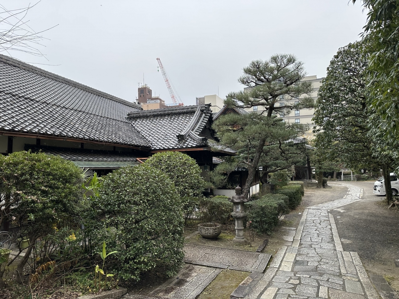 地下鉄の三条駅や京都市役所前駅から歩いて5分、寺町のアーケード商店街の中に天性院の入口があります。正式名称は曼茶羅山當麻院天性寺で、浄土宗のお寺です。入口は、商店街の店舗と同じように数mほどですが、参道が奥に100m近く延びています。