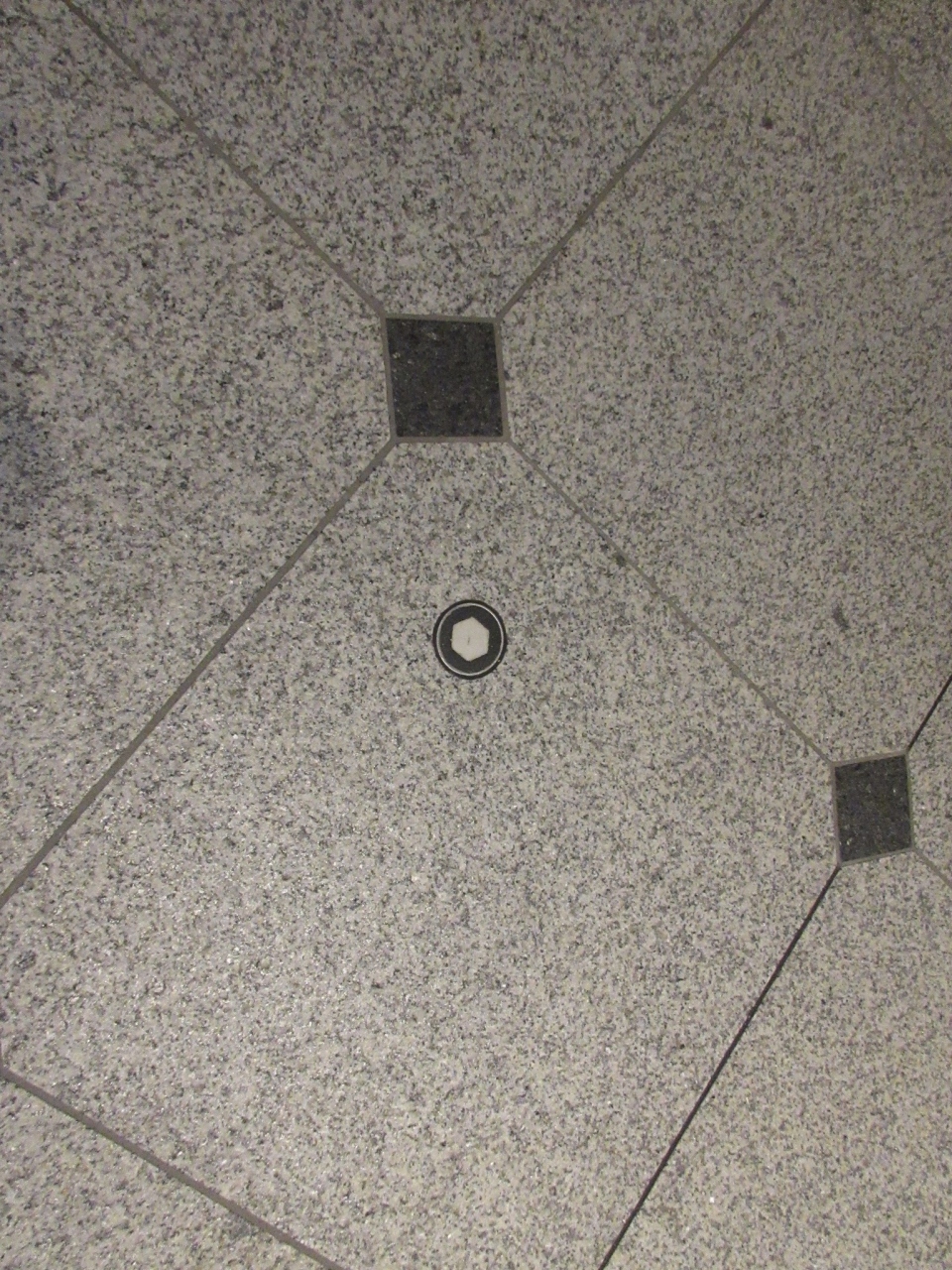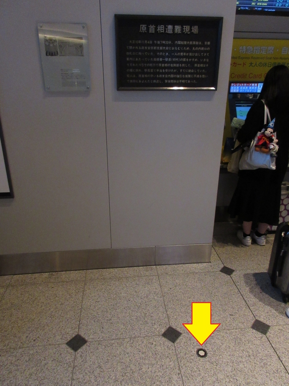 原総理の遭難現場は、現在の東京駅・丸の内南口の券売機の近くだったようで、壁に説明が書かれた「看板」と、床に小さな「ポイント」が記されています。