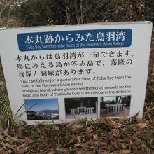 近鉄鳥羽駅から歩いて10分ほど、織田信長の水軍、九鬼嘉隆が文禄3年(1594年)に築城した城跡です。二の丸跡に旧鳥羽小学校が建てられ、本丸跡は同校のグランドとして利用されたりしていて城としての形をあまり見ることができませんが、本丸西側の石垣や家老屋敷跡の石垣などにわずかに面影を残しています。本丸跡には天守台なども無いが、天守跡と井戸跡があったことを示す標識があります。本丸跡からは眼下に鳥羽湾を見渡すことができました。
