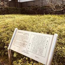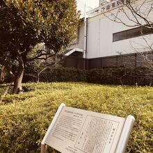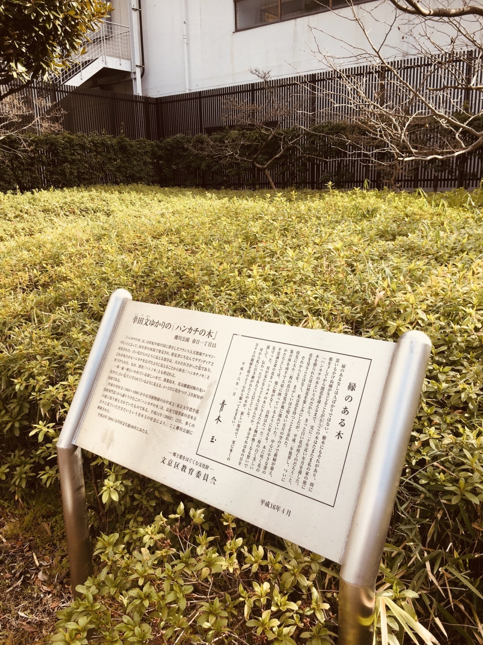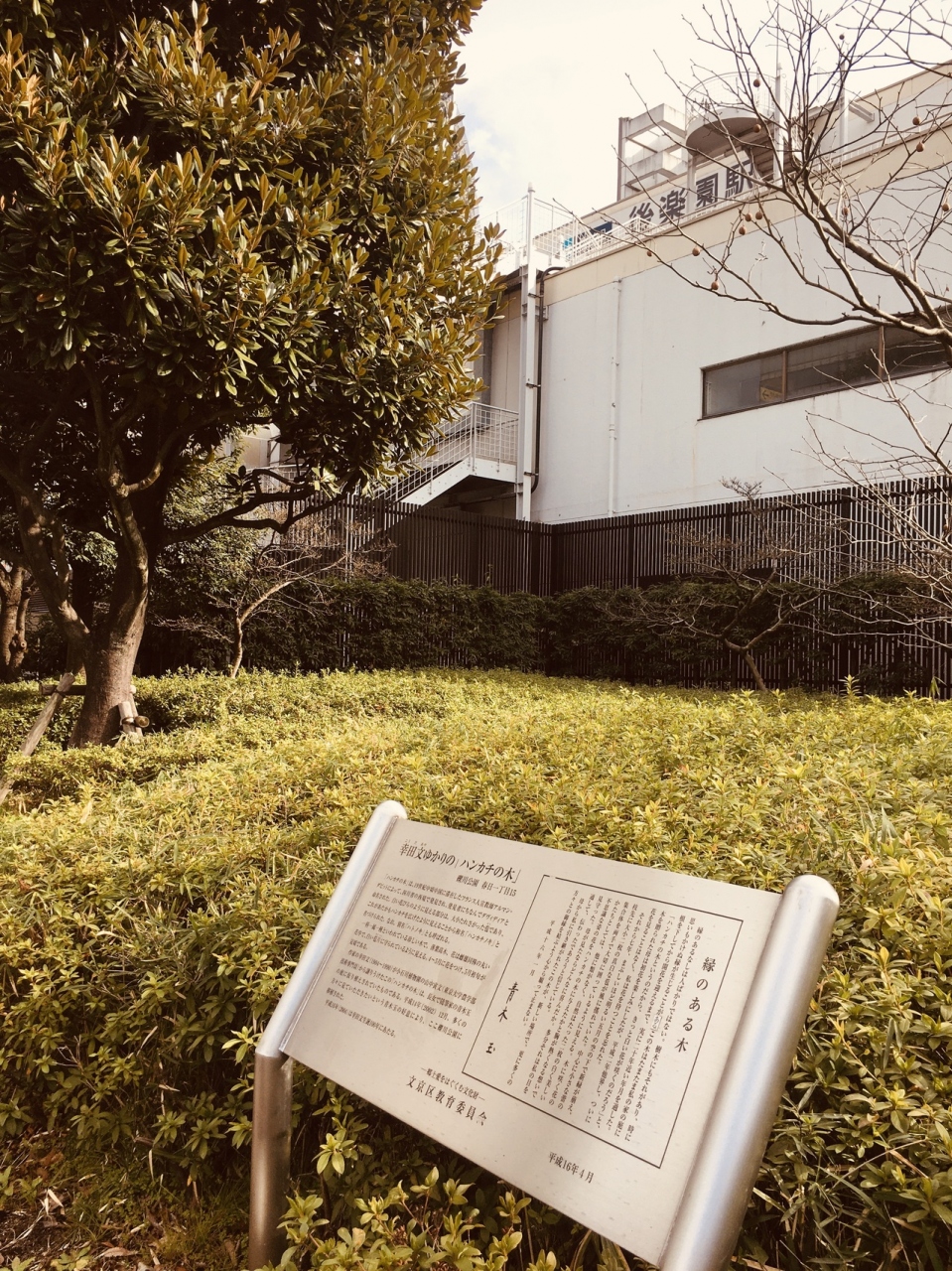 礫川公園内の通路沿いにあり、銀色の看板と後方には整備された草が生えていて、その中にハンカチの木が立っていました。木の枝には冬ながら緑の葉がたくさんありました。前面には座れるスペースがあり、前には花壇がありました。