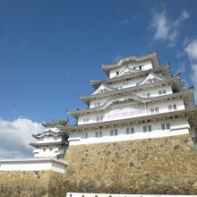 桜門橋から入り、青空にそびえる姿の美しい天守閣を目指して歩いていきました。三の丸の跡を通り、チケットを購入しいよいよ大天守へ。遠目に見た姿も美しかったですが、近くから見ると迫力が加わりさらに圧倒されます。平成の大修理で、表面の漆喰の塗り直しが行われ、白鷺城としての美しさもさらに増していました。
