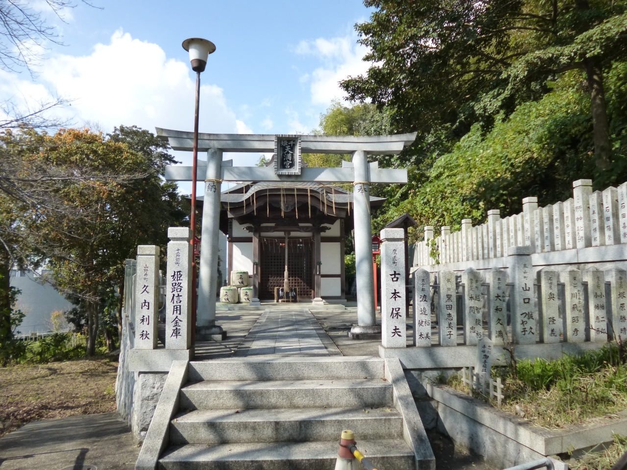 姫路城の北西側、小高くなった丘の男山の頂上付近にある男山配水池公園へ向かった時に立ち寄りました。公園までも結構な階段を上がりますが、千姫天満宮もその中腹にありますが、姫路文学館の方から行けば近いです。本多忠刻と再婚した家康の孫千姫が、本多家の繁栄を願って建立したそうで現在は新しくきれいな社殿になっていました。