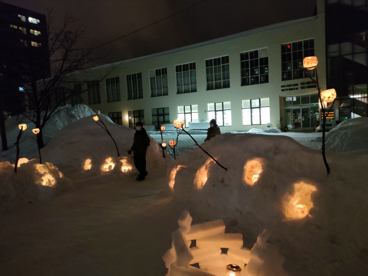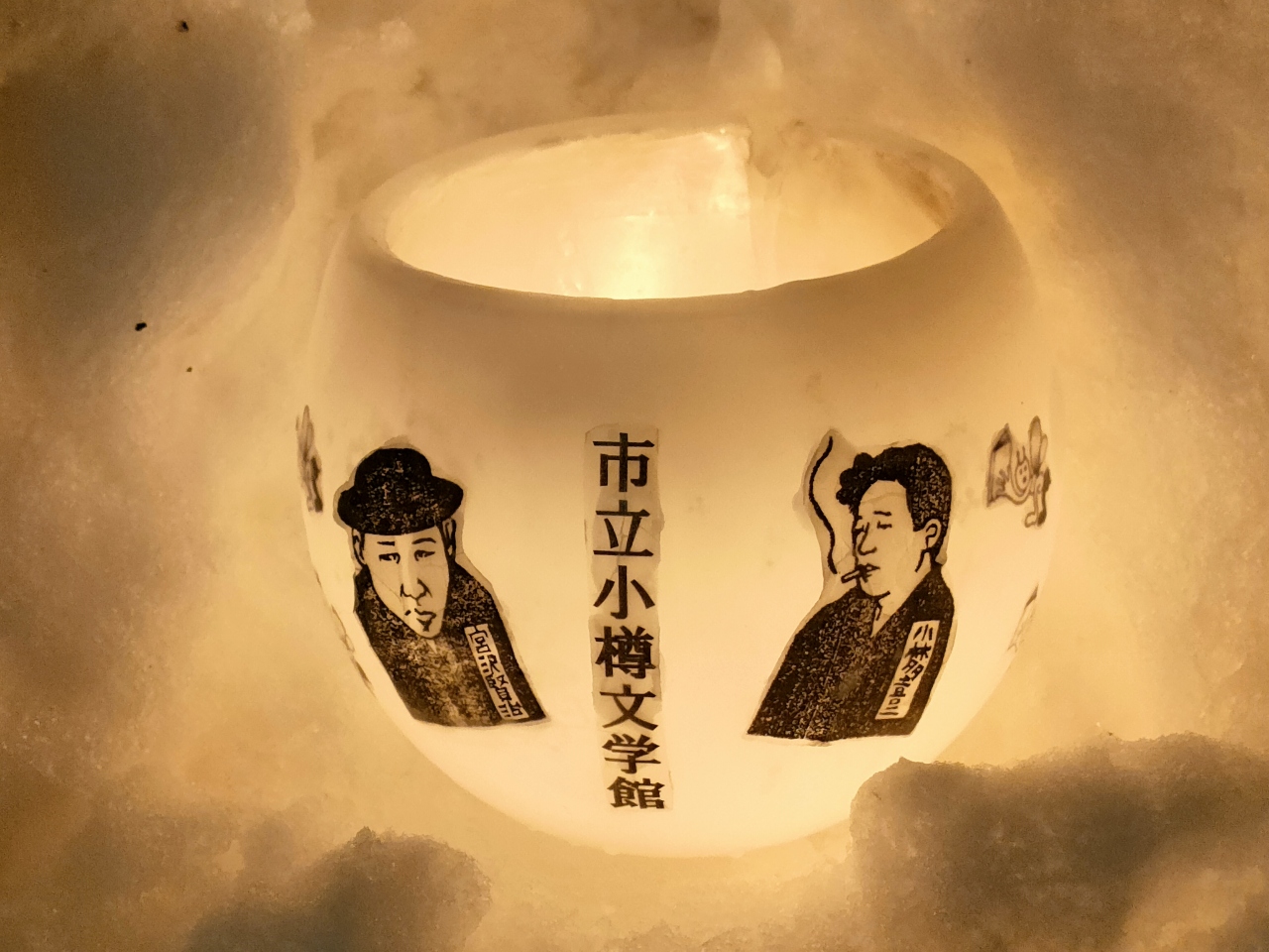 2月に行われる「小樽雪あかりの路」では、建物の前に文学館の銘の入った光るワックスボウルが飾られていました。