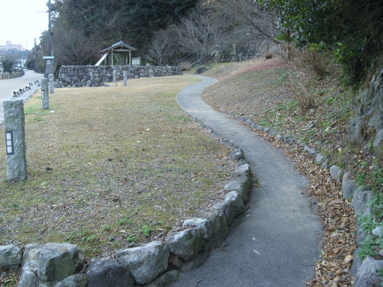 鳥羽城跡は高台にありその東側の麓に三の丸広場があります。広場には鳥羽城を築いた九鬼嘉隆の九鬼家の家紋が大きく掲げられて、ここから見える高く積まれた石垣はとても見ごたえがあるものでした。広場は近鉄沿線に面していて電車からでも九鬼家の家紋やい石垣を観ることができます。