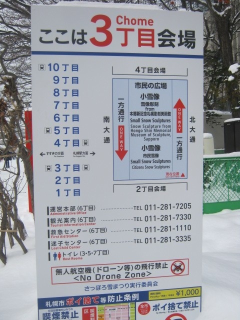 で、大雪像をいくつか眺めながら西に向かいましたが、例年と違うのは、会場が10丁目までの設置となっていて、11丁目・12丁目会場は設けられていませんでした。いつもは11丁目会場のマイバウム付近で開催されている国際雪像コンクールも、この年に関しては開催されておらず、11丁目全体が子供の雪遊び場みたいになっていて、これもまた味わい深い風景だなとホッコリしてしまいました。(或いは、従来だと子供の遊び場としてのメインである、つどーむ会場が設置されなかったため、その代替的な意味合いもあったのかしら、なんて…。)