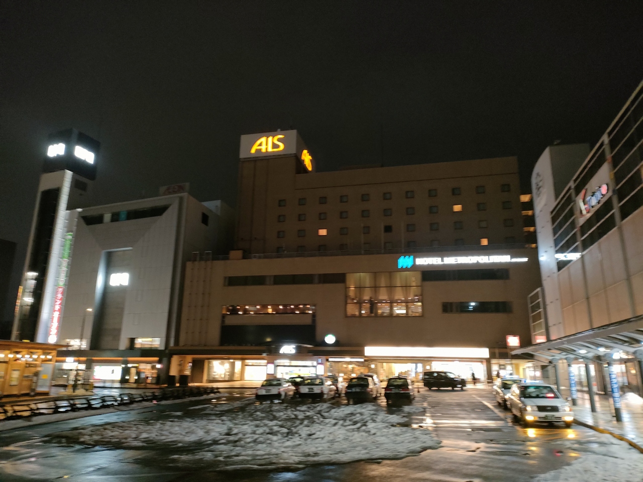 秋田駅西口、駅前広場右手にそびえたつJR系のホテルメトロポリタンが入る商業ビルです。2023年2月現在、多くのお店が改装工事のため、休業中ですが、スタバや無印良品など一部は営業中です。