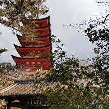 宮島桟橋から西に約20分歩いて、厳島神社の南側の道に入ると、左手の小高い丘に千畳閣(豊国神社)と五重塔が見える。いずれも国の重要文化財である。五重塔は高さ約28m、桧皮葺で和様・唐様を融合した見事な建物で、晴天の日には、五重塔の朱色が青空に映えてとても綺麗である。本尊の釈迦如来などは、明治の神仏分離で大願寺に移されたそうである。千畳閣は、豊臣秀吉が建立した大経堂で、入母屋造りの大伽藍で857畳の畳を敷くことができる。以前、訪れたとき堂内に「算額」があり、しばし「頭の体操」をした。