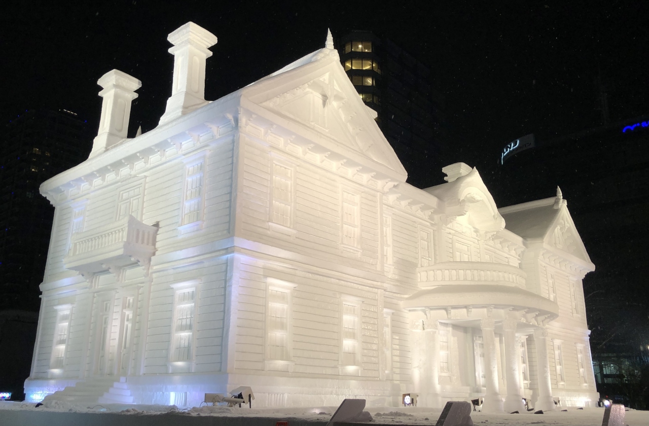 さっぽろ雪祭りのメイン会場でした。3年ぶりの開催と言うことで、大勢の方で賑わっていました。自衛隊が一か月かけて作ったという大きな雪像は、プロジェクションマッピングで、カラフルに映像が映り、大変美しかったです。