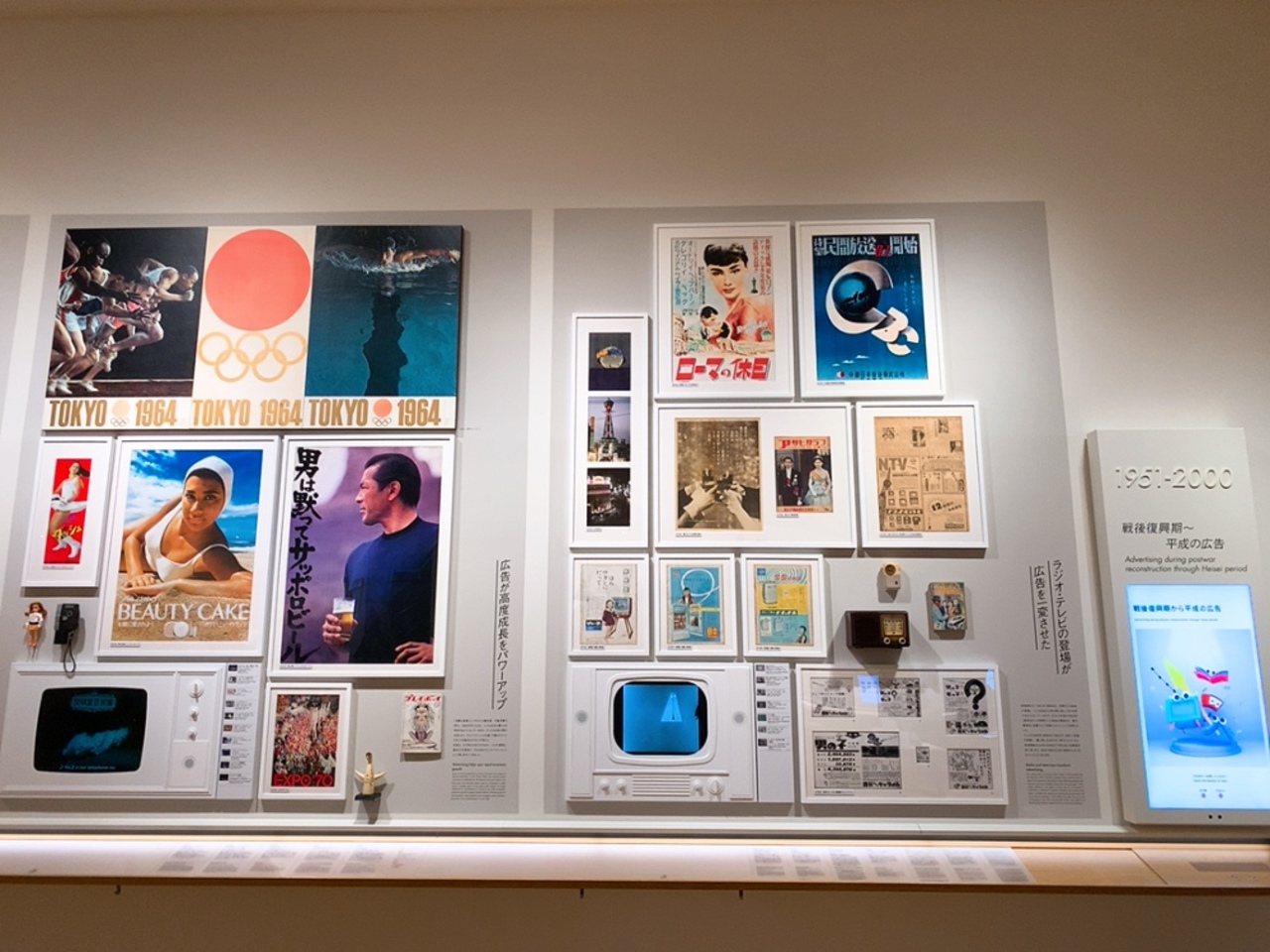 ココでは、江戸時代の広告から、現代のTVCMまで、広告の歴史を学べ、時代に合った広告を色々と見ることが出来ます。 戦時中から敗戦直後の広告は心苦しくなるものも多かったですが、戦後の復興以降の、目まぐるしい広告の変化は見ていて本当に楽しかったです!