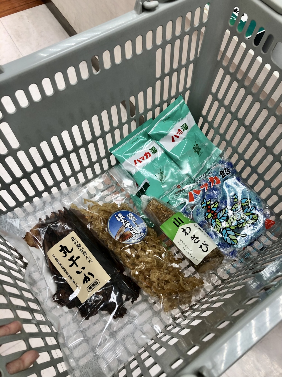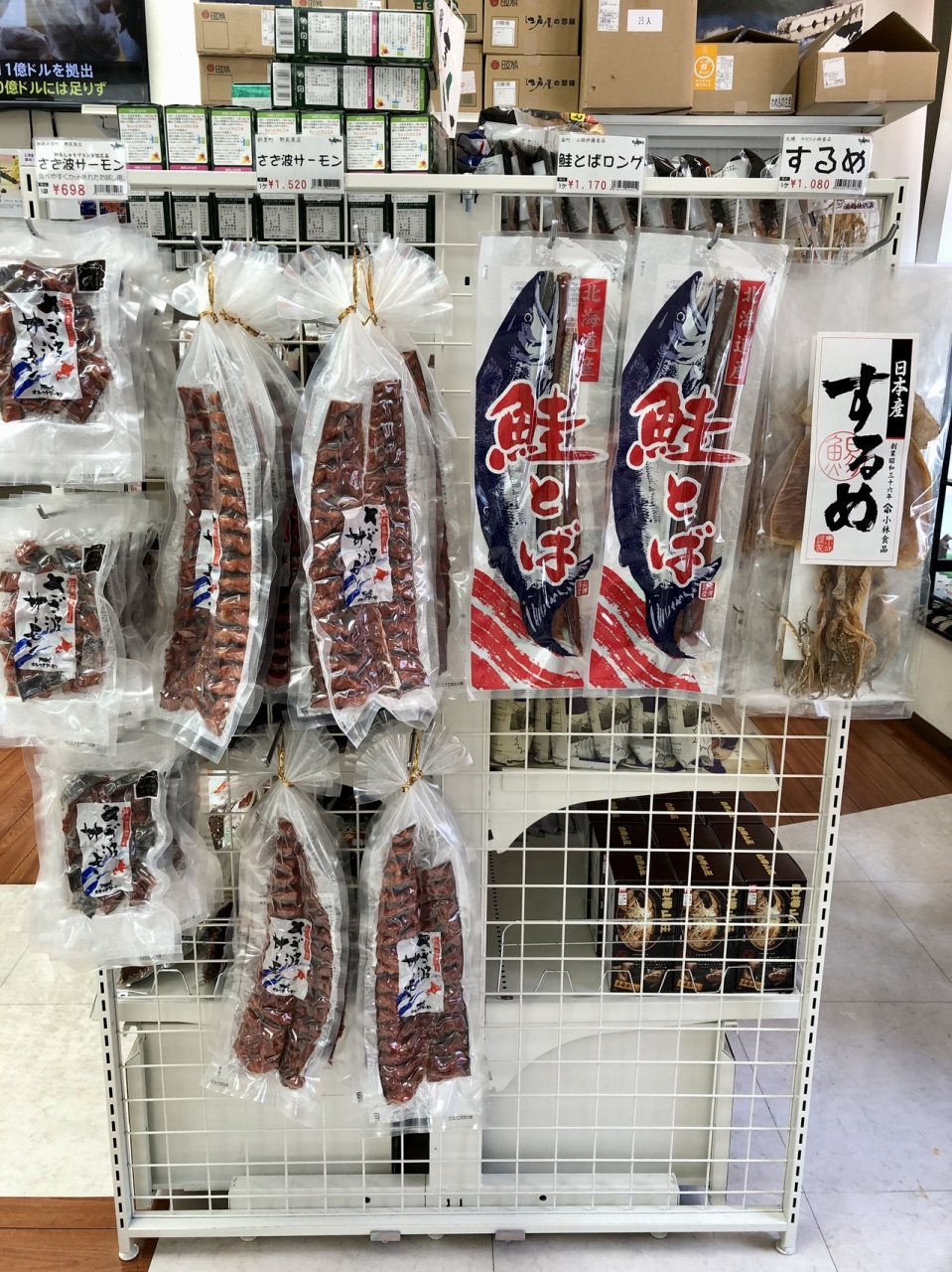 まずは小さいものだけ買って、鮭とばとか昆布とか嵩張るものは帰りに買いなよと言われ、そうしました。