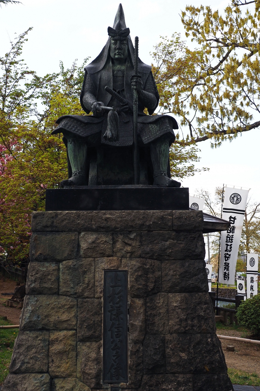 舞鶴橋を渡ると右側に、左に【龍】右に【毘】の旗が掲げられた上杉謙信之像がにらみを利かせています。