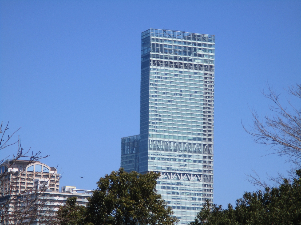 あべのハルカス、高さ300mの高さがあるだけあって、離れたところからでもよく見えます。今回は大阪五低山の一つ、天下茶屋近くの聖天山の頂上北側にある「聖天山公園」からあべのハルカスを見ました。天気のよい日で青空に映えていました。