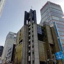数寄屋橋の交差点から東京よりに少し行ったところにある、外堀通りに面して建っています。少し変わった建物なので、なんだろうと思いますが、十字架があるので教会だと分かります。教会というと誰でも入れるのですが、ちょっとここは入りにくい雰囲気があります。
