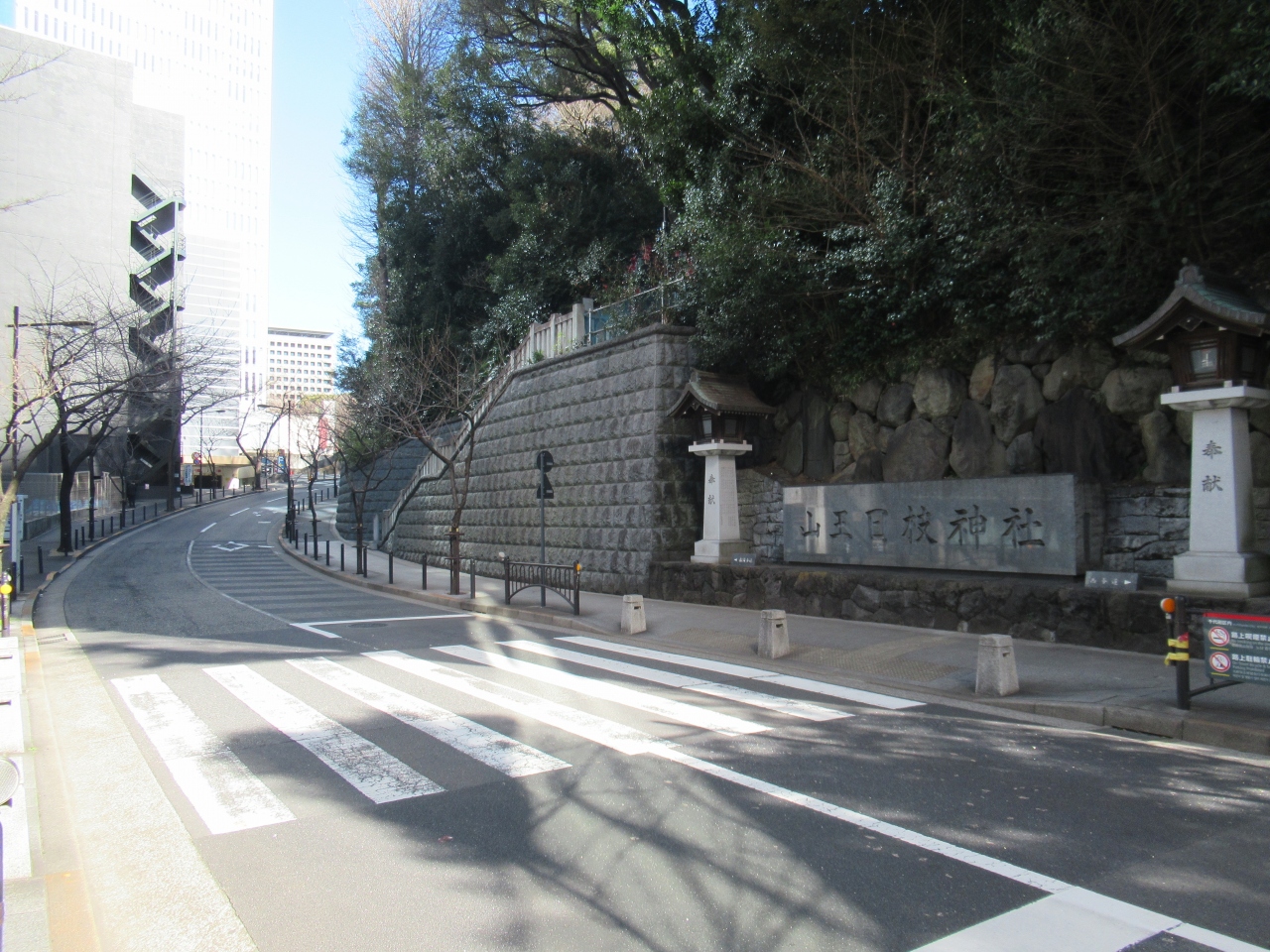 外堀通り沿いに建つ日枝神社の黒い鳥居から表参道に向かう上って降る急な坂道で、日枝神社を囲むようにして造られています。坂の途中には日比谷高校があり、黒い鳥居近くの坂沿いには、日枝神社の境内に建つ山王稲荷神社に向かう稲荷参道があり、たくさんの幟と鳥居が建っています。稲荷参道は日枝神社社殿に向かう近道にもなっています。