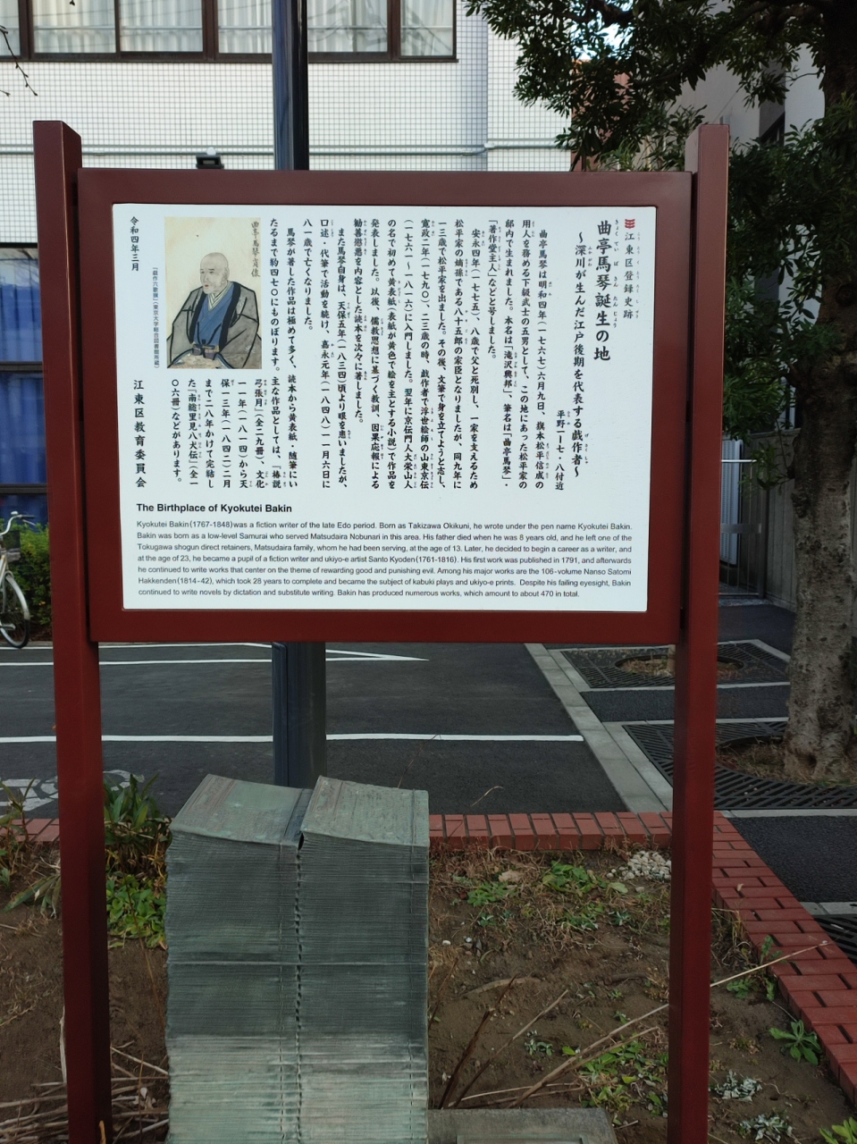 清澄庭園の南東側にあります。松尾芭蕉ゆかりの採荼庵跡を見学した後でそのまま少し北に行くとありました。南総里見八犬伝の著者として有名ですが、それ以外のことにはあまり知らなかったのですが、結構詳しい説明文があってよかったです。