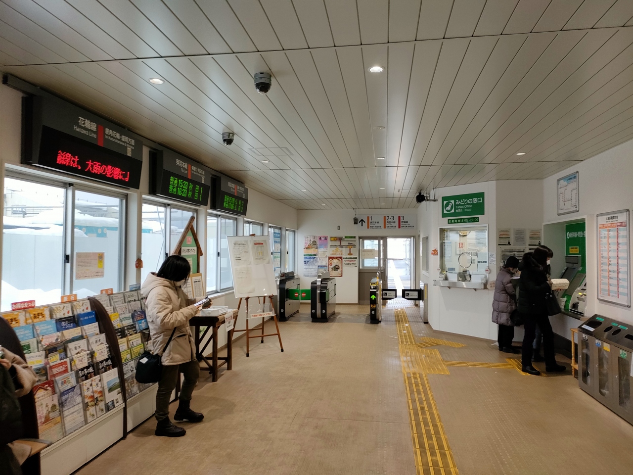 仮駅舎内の待合室は、暖房は効いているものの、座る椅子も少なく、不便なので、待ち合わせが長くなる場合は、駅を出て向かいの花善さんを利用することも。