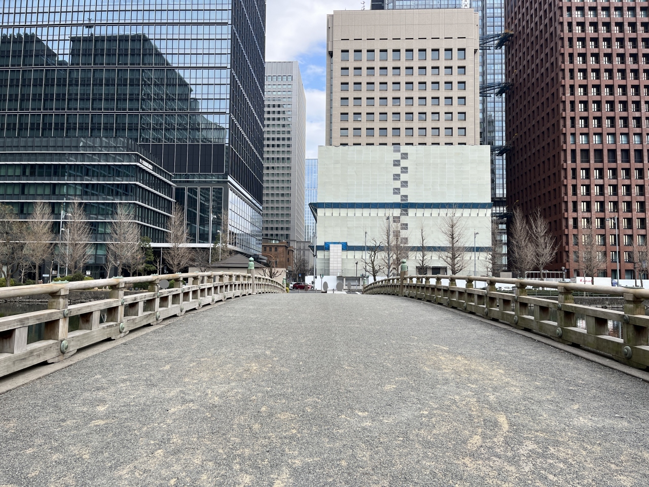 皇居外苑のそばのお堀にかかっている橋です。現在は歩行者専用の橋で、自由に渡れるようになっています。もともとは木の橋だったものをコンクリートで再現したものだそうで、ここにお城があったことが感じられました。