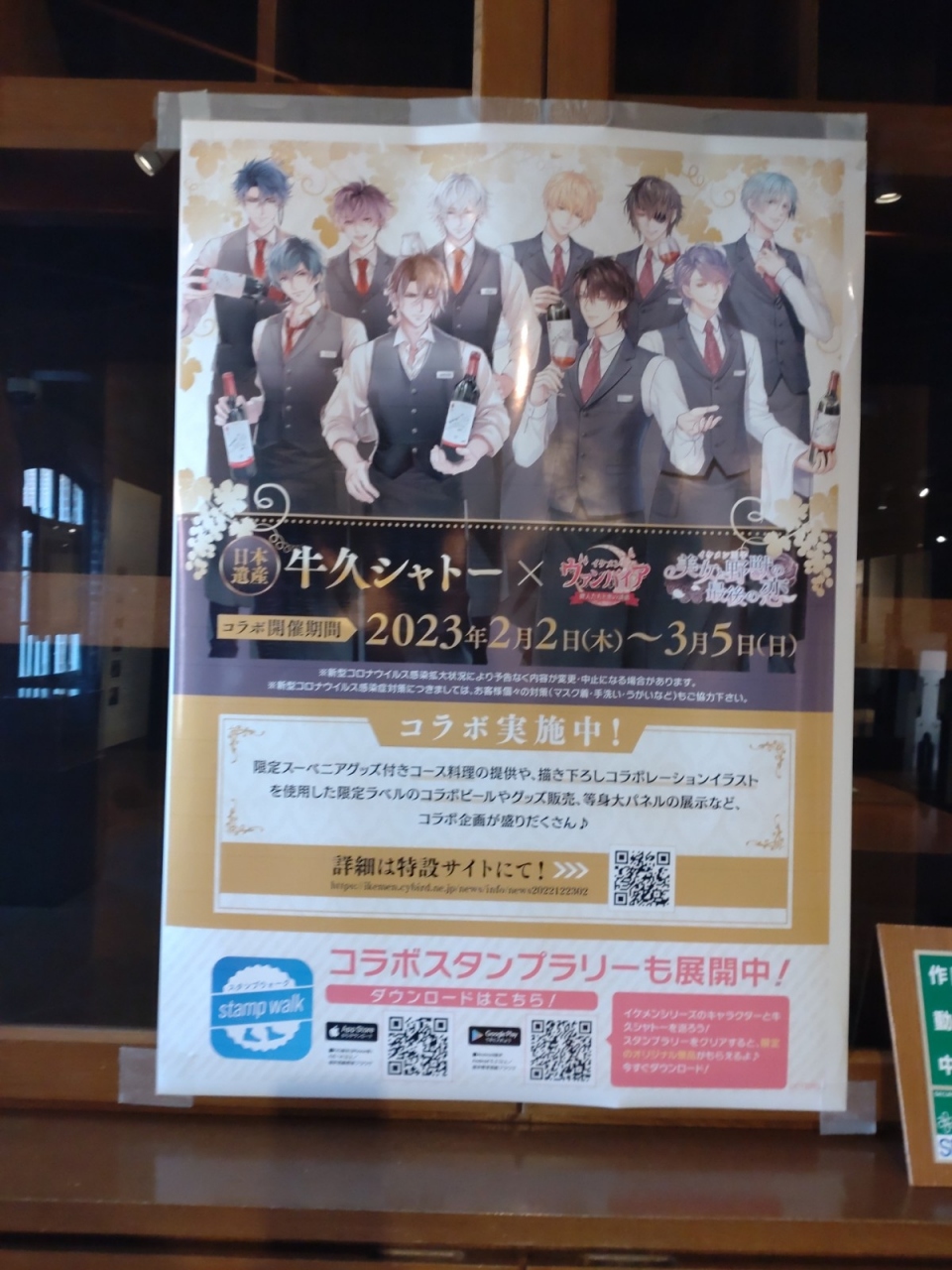 ウオーキングで牛久シャトーに行きますが、建物に入ることなくいましたが久々に入るとイケメンが樽の隣に立ってました。スマホにある恋愛ゲーム『イケメンヴァンパイア◆偉人たちと恋の誘惑』、『イケメン王子 美女と野獣の最後の恋』とのコラボイベント中でした。期間は2/2~3/5で、飾ってあるのはパネルだけでしたが内容を調べると見学ツアーもあり、非公開の本館が見られるとありました。静かなシャトー、賑わうといいなと思いました。
