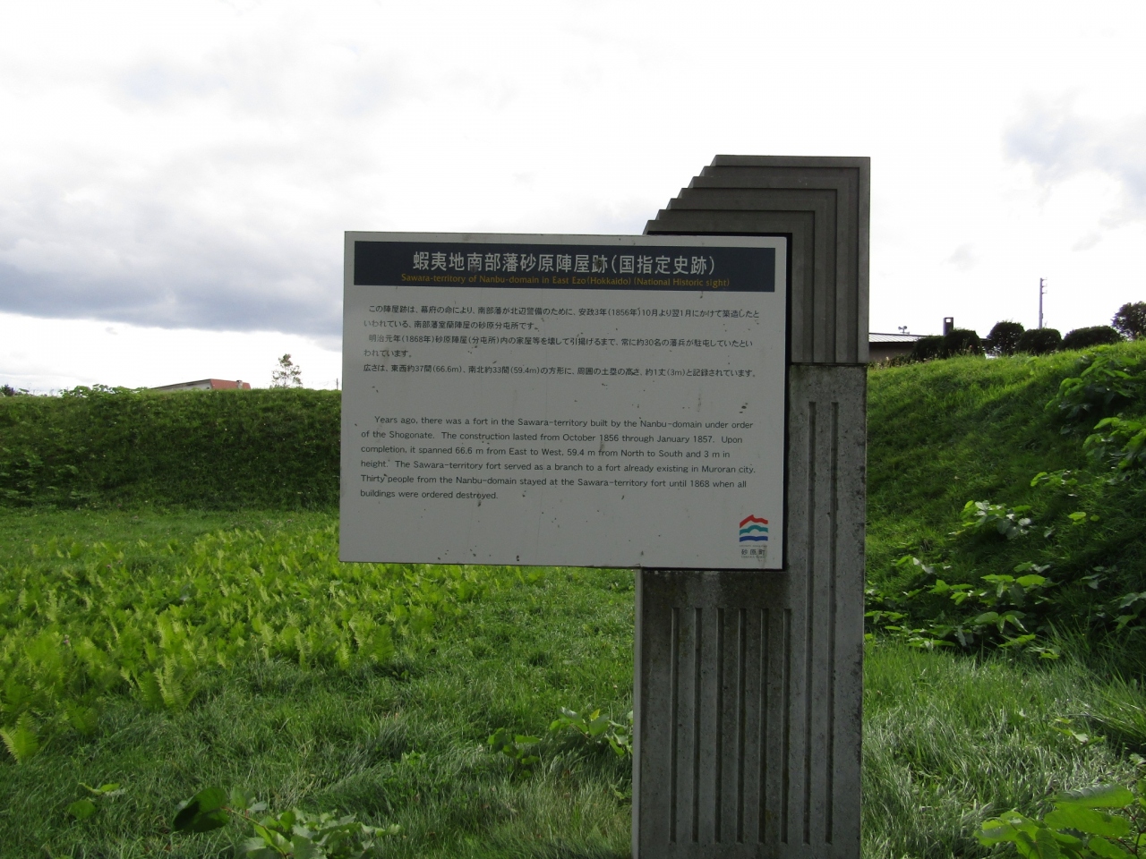 説明板に「幕府の命により、南部藩が北辺の警備のため設置した南部藩室蘭陣屋の砂原分屯地跡で、周囲に土塁が残る」とあったので改めて良く見ると、周囲に小高い土塁がありこれが史跡指定になっているようですが、説明板がなければわからないほど目立たない存在です。