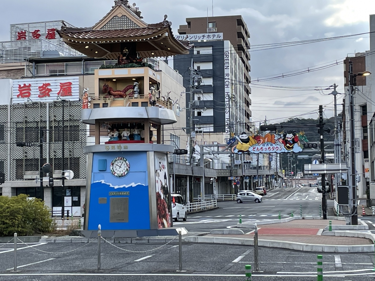 JR浜田駅前にあるからくり時計。前回訪れたときは故障でストップしていたので、今回初めてからくりを目撃することができた。人形が石見神楽の演目「大蛇」を演じるもので、にぎやかな音楽が流れる中、コミカルな動きを見せて楽しませてくれる。三階に分かれてお囃子や大蛇がうねる様子が派手に展開され、えべっさんなど有名キャラクターも場を盛り上げる。最上部の屋根はあかい石州瓦だ。