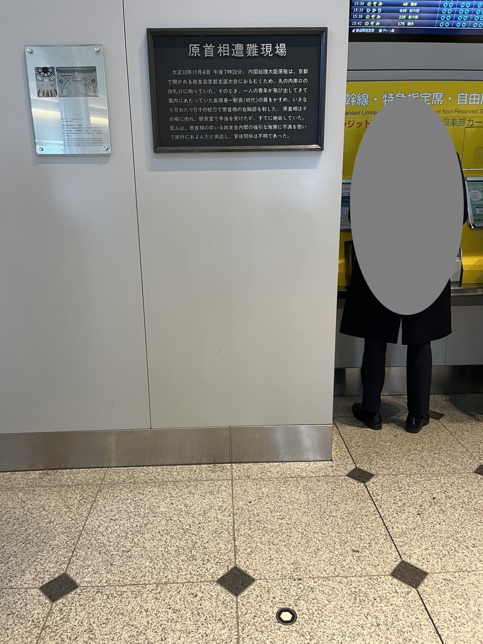 東京駅丸の内南口の切符売り場のそばにあります。今では人が絶え間なく行き交うにぎやかな場所ですが、足を止めて見てみると歴史的な事件があった場所だということが実感できました。近くを通る際などに、見てみてもいいかもしれません。