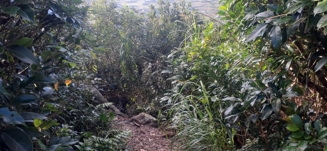 そこからは雑草の中の獣道のような道を行くと最後のスペースの雑草の合間から、祖納の町が見えました。
