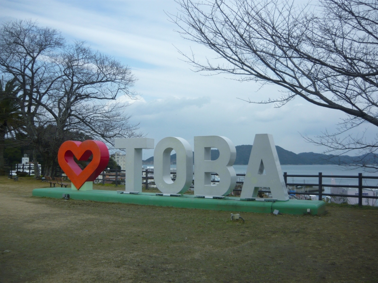 JR・近鉄鳥羽駅から歩いて15分くらい、鳥羽城跡の一部が城山公園として整備されています。公園と言っても遊具などは無く広い芝生広場のような感じで、鳥羽湾や鳥羽水族館を見渡すところに「TOBA」と表示された大きなモニュメントがあったので記念写真を撮りました。