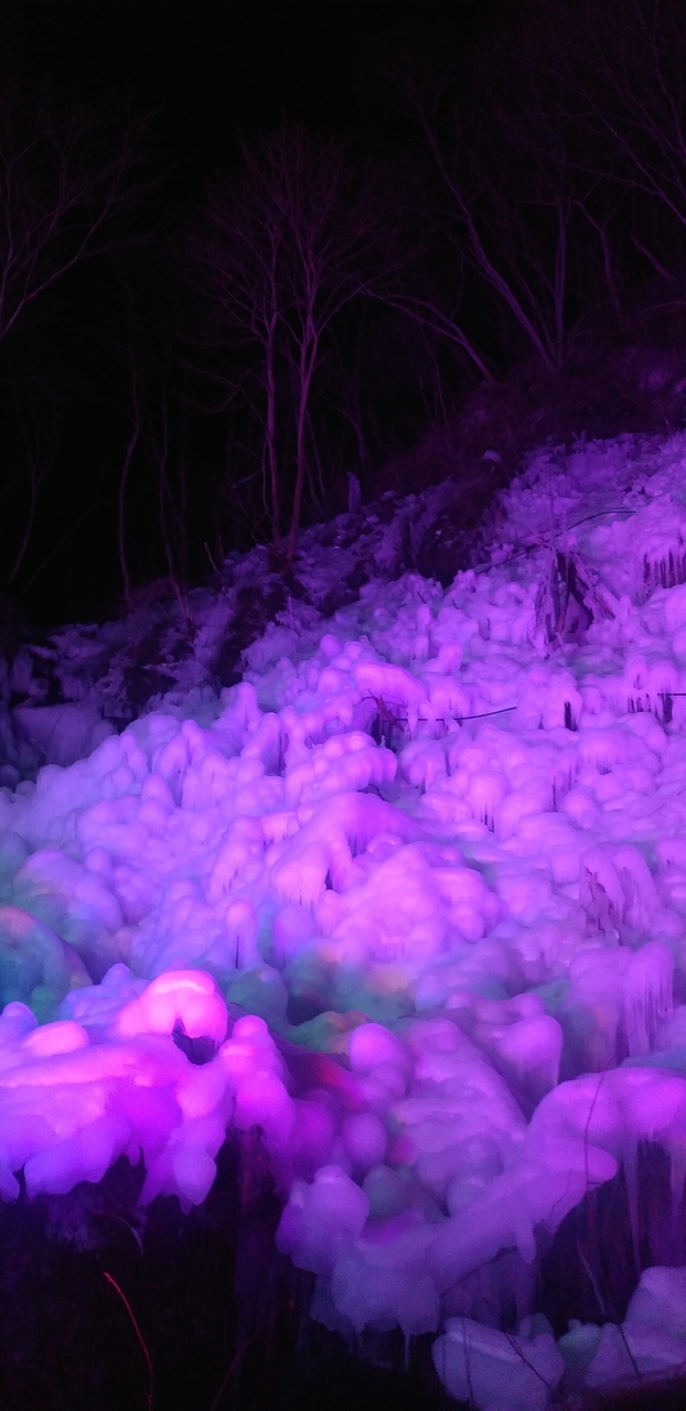 大分前に見かけて見学したことかありましたが、今回は時間予約制で、駐車スペースも小学校の校庭で距離もあり、氷柱へいくのに大分歩きました。チップは敷き詰めてありますが、道はスニーカーのような設置面積の大きいものでないと歩くのが大変だと思います。