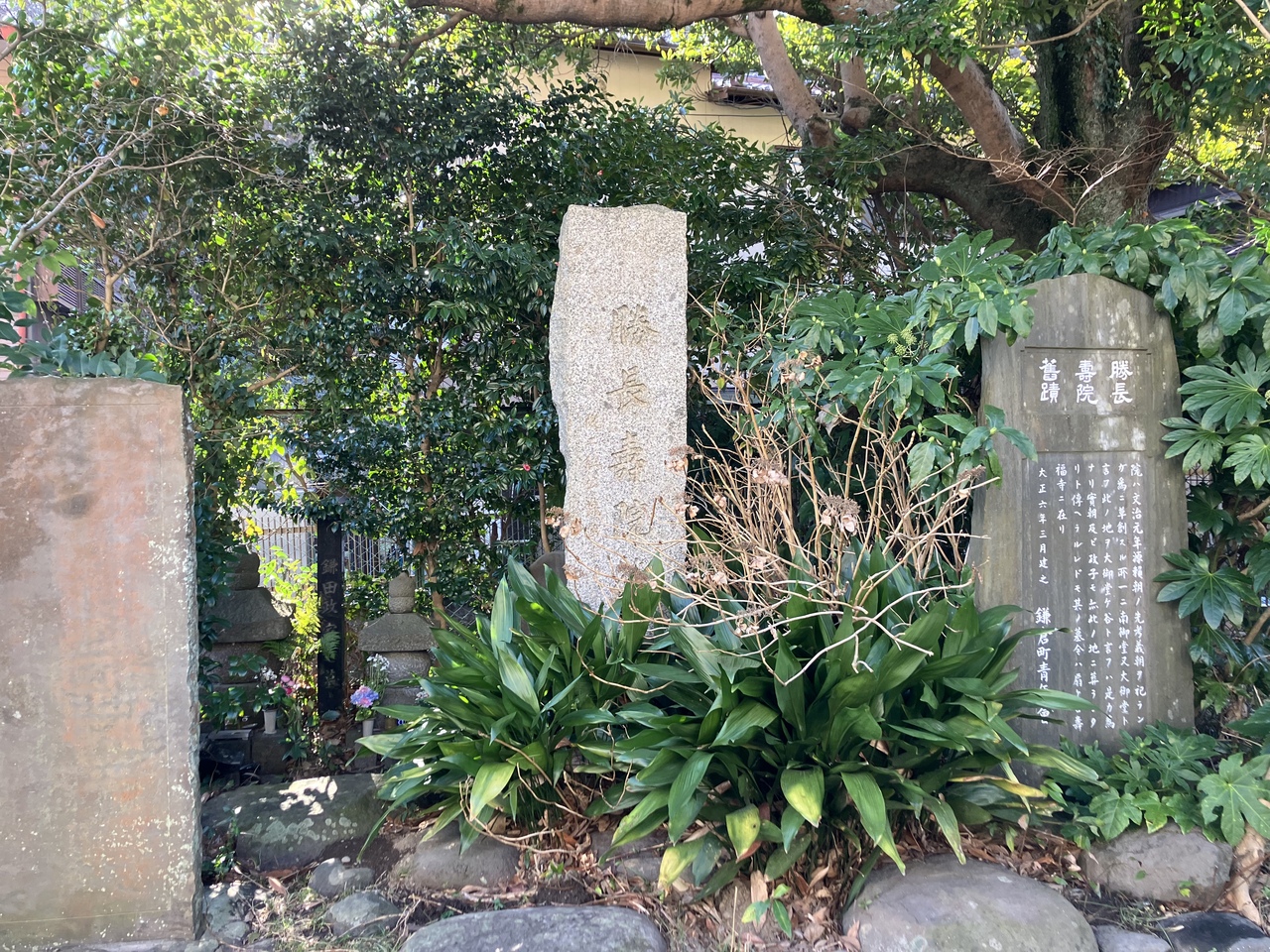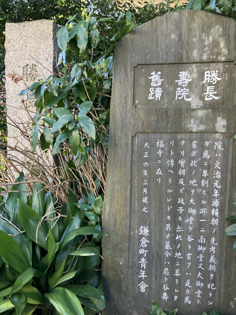 鎌倉駅から徒歩で30分ほどです。金沢街道の「大御堂橋」から橋を渡って南へ住宅地の谷戸道を歩いたところにあります。碑と源頼朝と鎌田政清の小さな供養塔がひっそりとあるだけです。勝長寿院は鶴岡八幡宮、永福寺と共に鎌倉の三大寺院だったそうです。