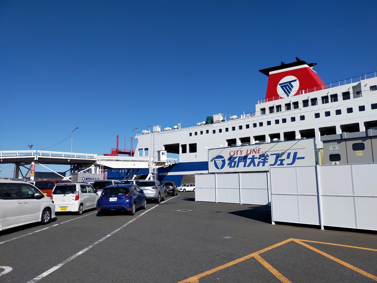 新門司港は結構広いです。関西方面行きのフェリーには、阪九フェリーと名門フェリーがありますが、タ一ミナル建物は別でした。高速道路を新門司インターで下りることは変わらないですが、阪九フェリーは北側に、名門フェリーは南側にありました。ナビよりも看板を見たほうが良いです。